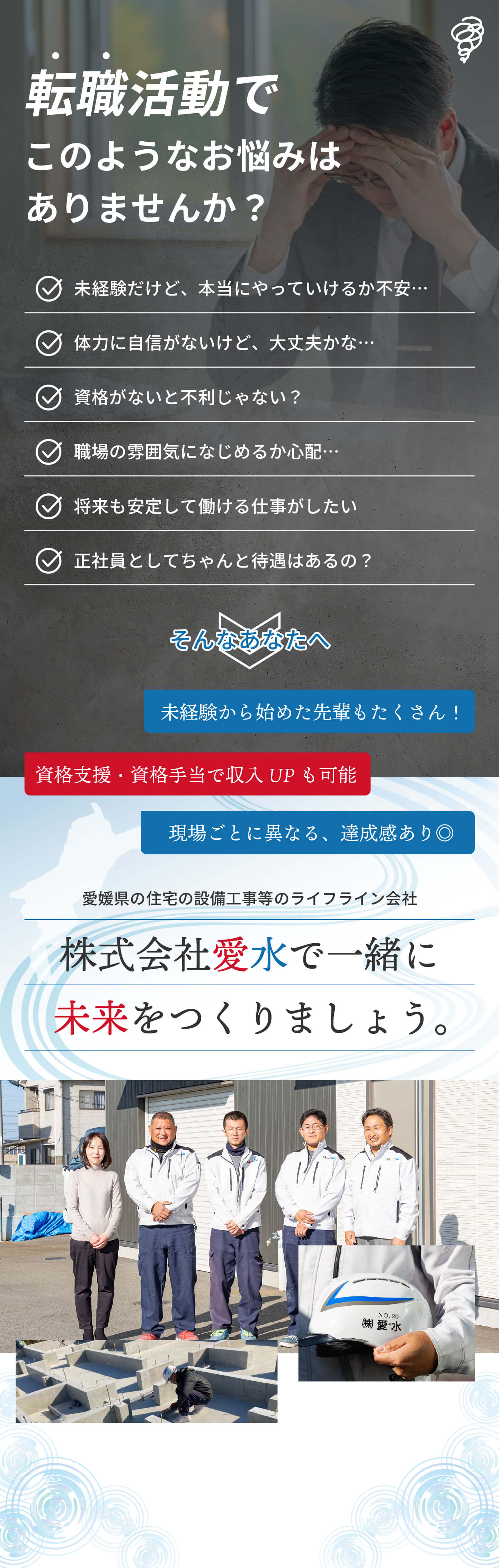 【管工事業・土木工事業・水道施設業 】愛媛県知事 (特) 第8253号 【浄化槽工事業】愛媛県知事 (届-60) 第275号 【浄化槽保守点検業】愛媛県知事 (登-24) 第151号 【産業廃棄物収集運搬業】愛媛県知事許可番号 3810012244 |