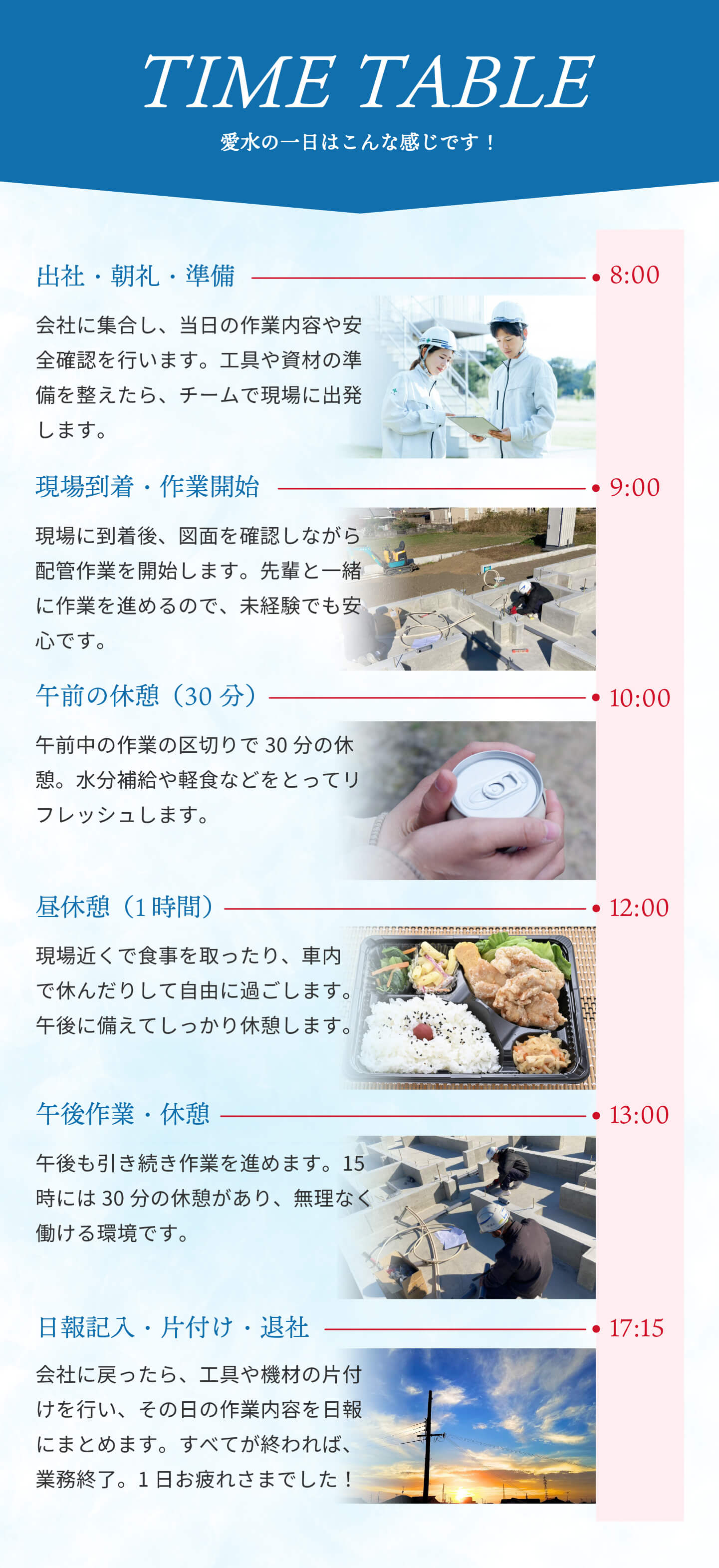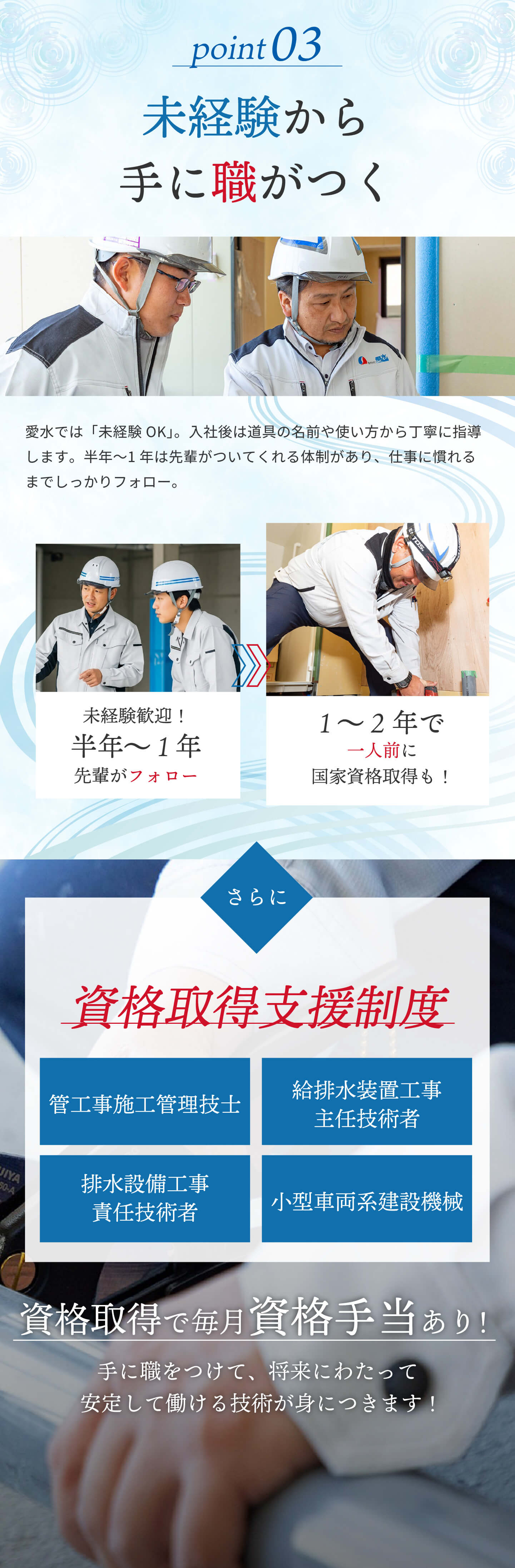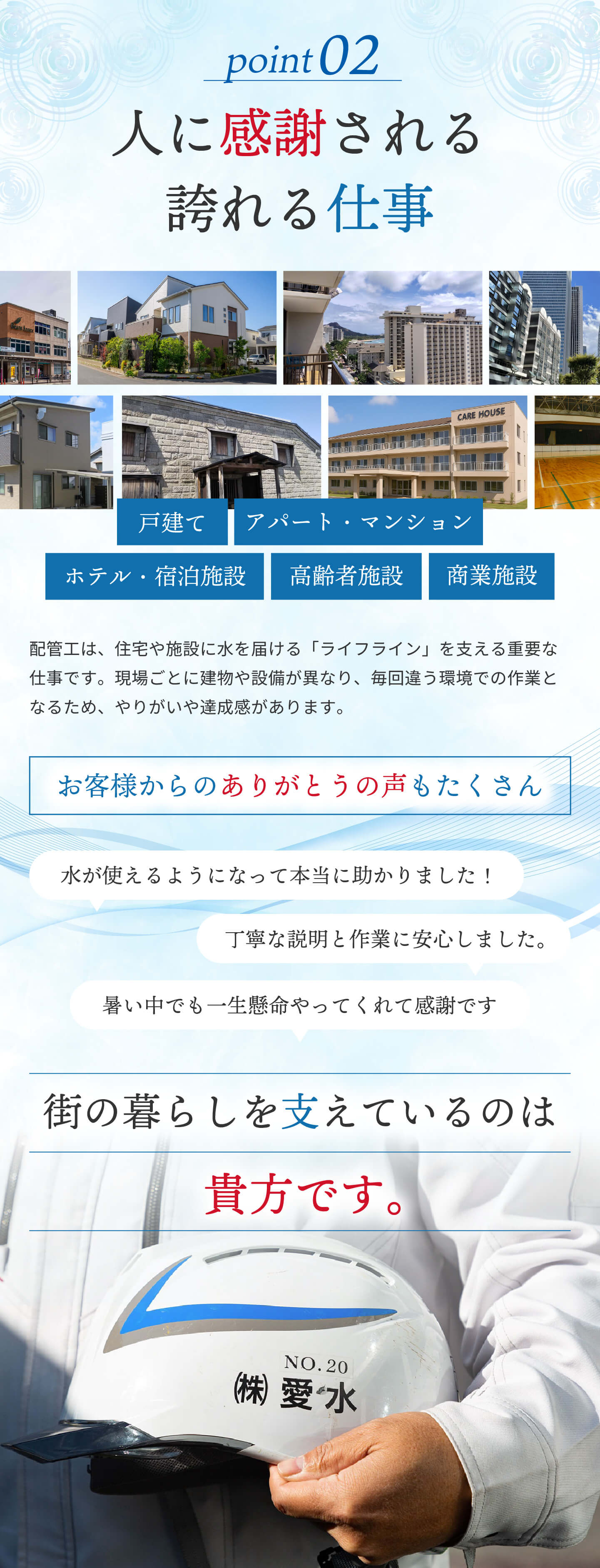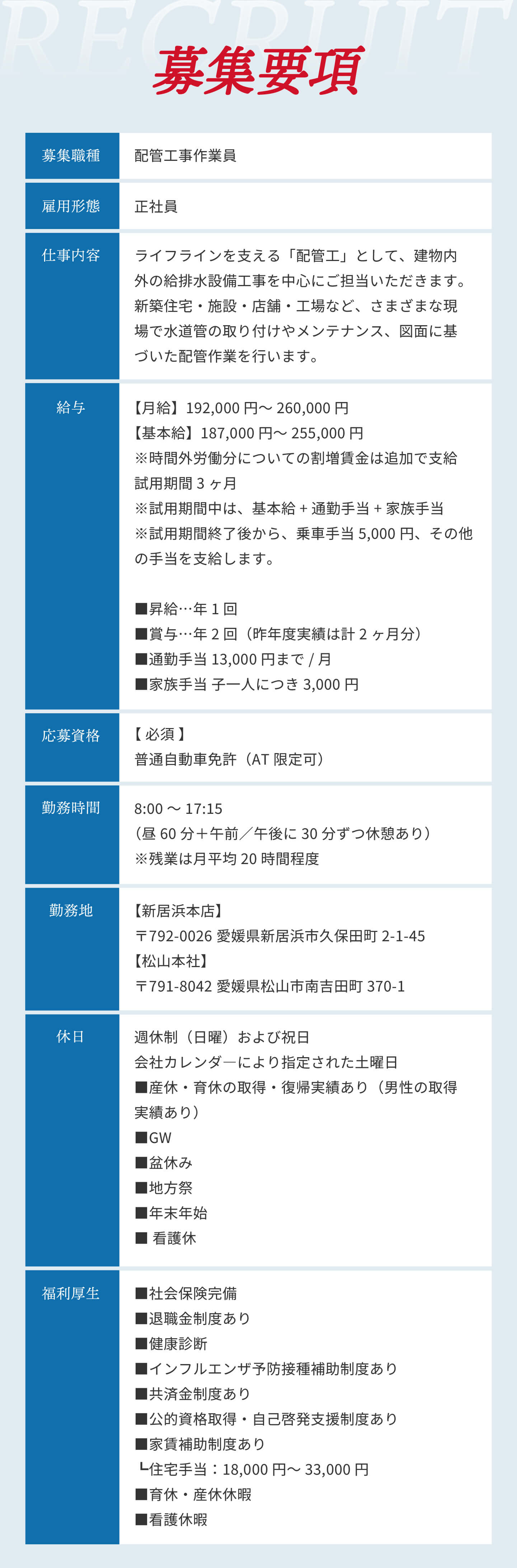 | 事業内容 | 管工事業(給排水衛生設備工事、空気調和設備工事、水道設備工事、水処理施設工事、消火設備工事)、住宅設備機器販売、施工、増改築他 |